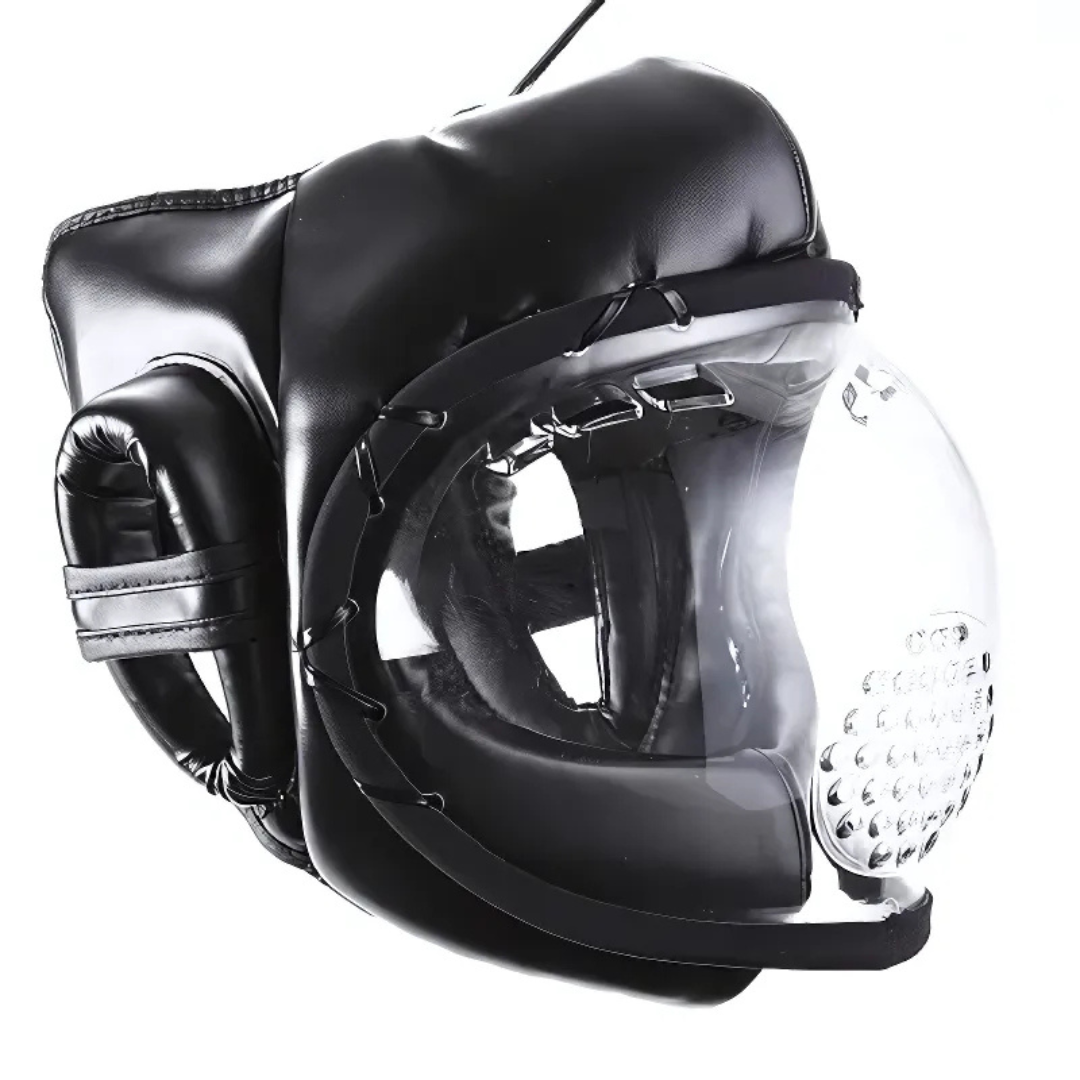 Professional Stealth Black headgear featuring a shatter-resistant face shield for the ultimate low-profile, high-protection look.